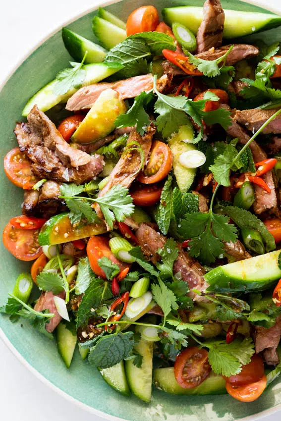 - Assemble and serve: While the steaks are resting, prepare the salad vegetables. I like to slice the cucumber into long thin slices. Halve the cherry tomatoes and slice the spring onions. Pick the mint and coriander/cilantro leaves off the stems and finely slice a few red chillies. If using, crush the peanuts. Combine the salad ingredients and steak in a large bowl and pour over the reserved dressing. Toss well then serve.
