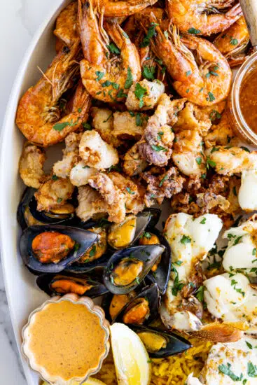 - Seafood: I used shrimp, mussels and calamari/squid. Feel free to add clams, scallops, crab, lobster or other seafood of your choice.