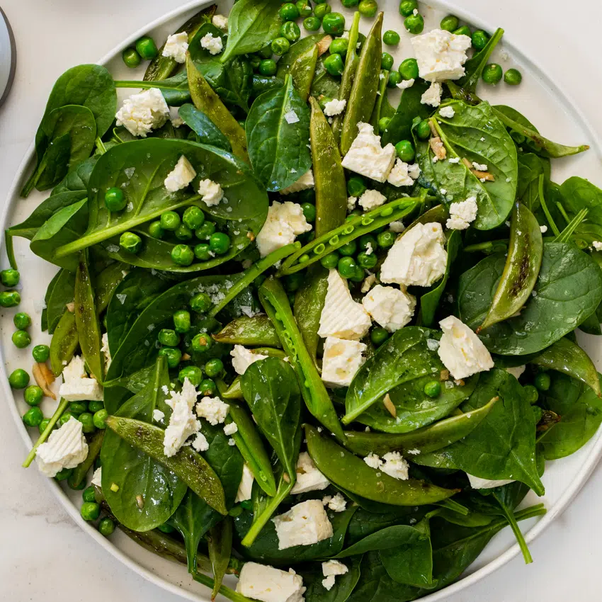 - Assemble the salad: Place washed and dried baby spinach leaves in a large bowl/serving dish, top with the cooked peas and crumble over the feta cheese.