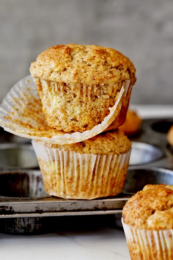 - Dry ingredients: Add flour (I like using cake flour for muffins), whole wheat flour, baking powder, baking soda, salt and cinnamon. Mix until just combined then scrape the bowl and fold in any pockets of flour. Once the flour goes in, you don’t want to overmix as this can cause the muffins to be tough once baked.